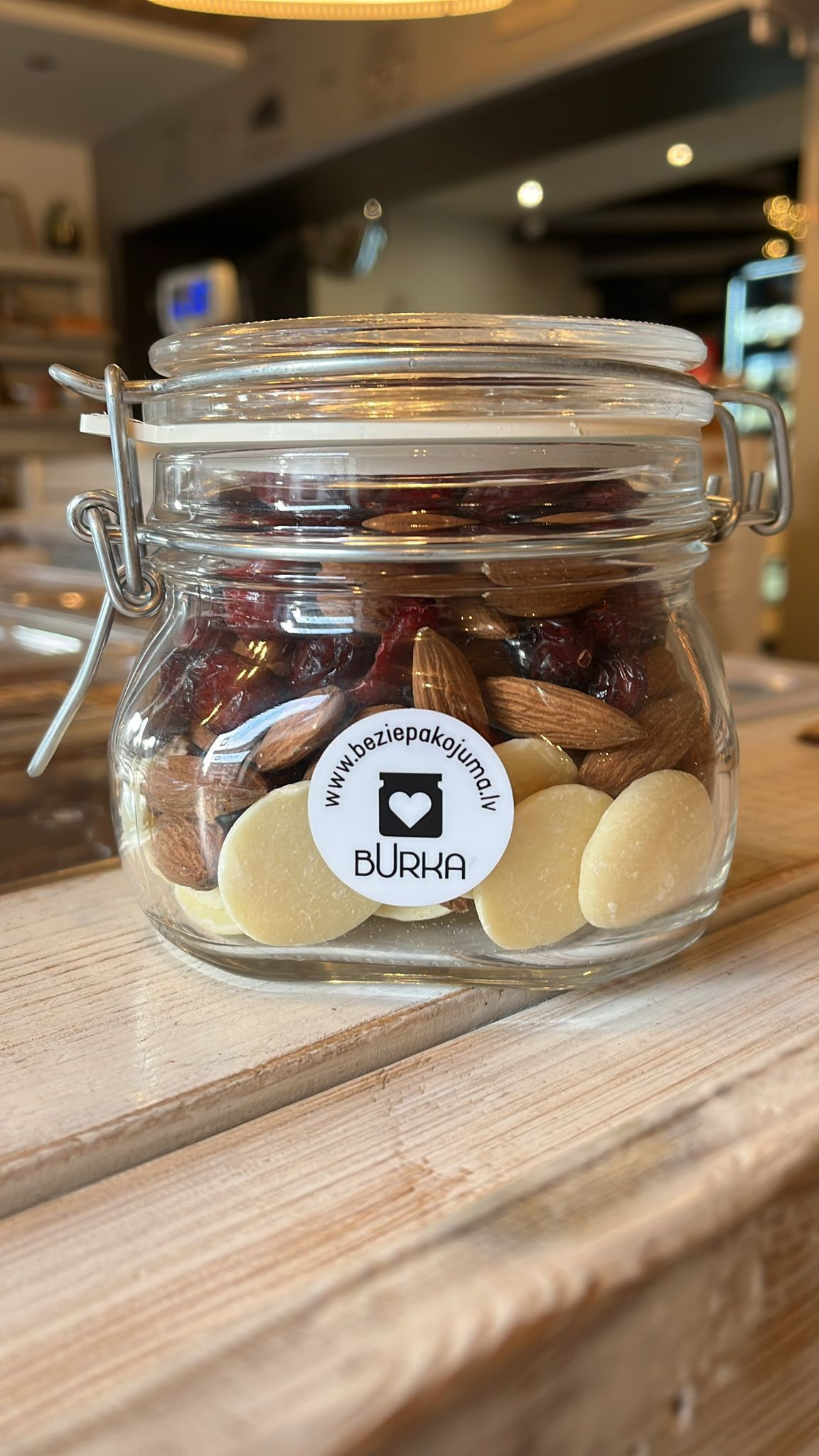 Hermētiska dāvanu burka, kuras sastāvā ir rieksti, žāvētas ogas un šokolāde.