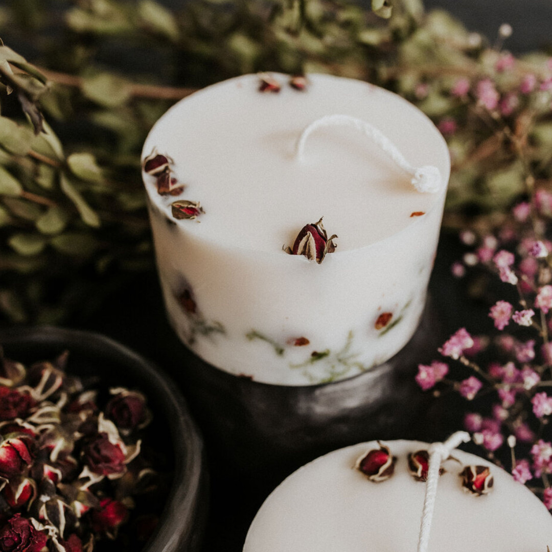 Gardenia Eco svece “Roze” ar kaltētiem rožu ziediem, rožu ēterisko eļļu un rapšu vasku.