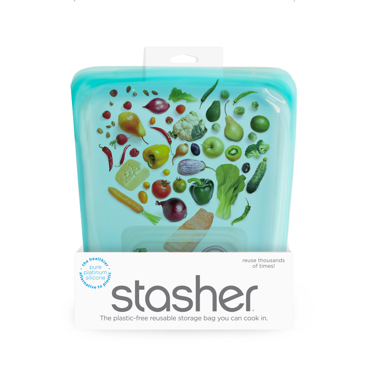 Izgatavots no 100 % dabīga, ar platīnu apstrādāta silikona, Stasher ir piemērots pārtikai, izturīgs pret temperatūru un ilgmūžīgs, tajā pat laikā tas nesatur BPA un BPS un neizraisa alerģiju, tāpēc tas ir drošs cilvēkiem un planētai.